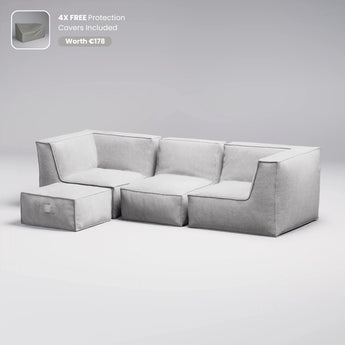 The set combines 4 modules — offering endless modular possibilities. Designed for all-year outdoor use, it’s 100% weatherproof, stylish, and built for ultimate comfort and flexibility.